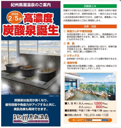 【お知らせ】紀州黒潮温泉に「高濃度炭酸泉」が誕生いたしました!(1/3更新)