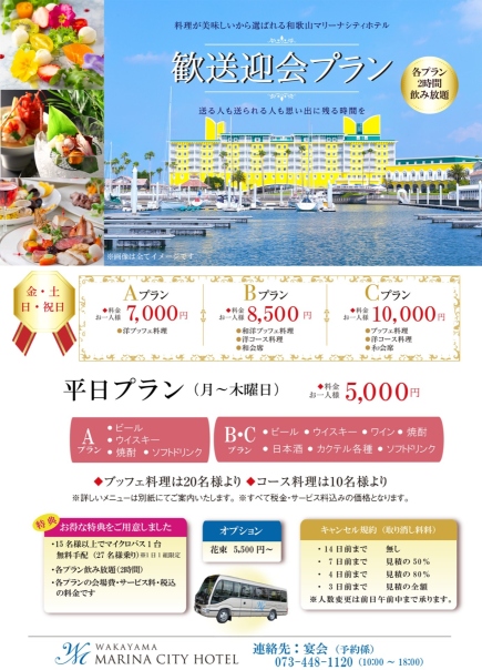 「歓送迎会プラン」送る人も送られる人も、マリーナシティホテル自慢の美味しい料理で宴会しませんか?(12/22更新)