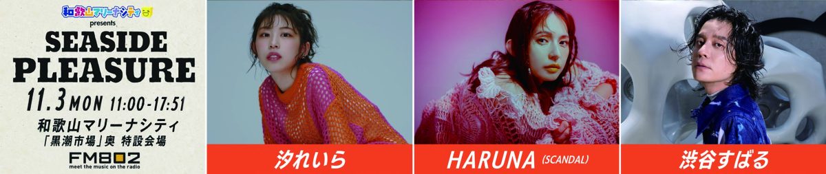 11/3(祝)は和歌山マリーナシティからFM802 ”7時間”公開生放送!!「汐れいら」「HARUNA(SCANDAL)」「渋谷すばる」3組のゲストアーティストを迎えスペシャルライブで会場を盛り上げます♪