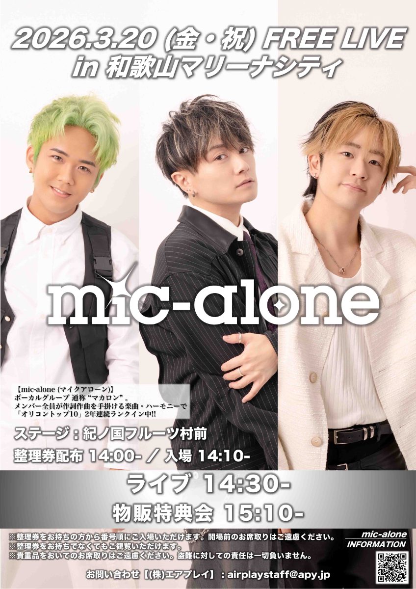 東京・福島を拠点に活動するボーカルグループ mic-alone(マイクアローン)が、2026年3月20日(祝)和歌山マリーナシティにてフリーライブを開催!!